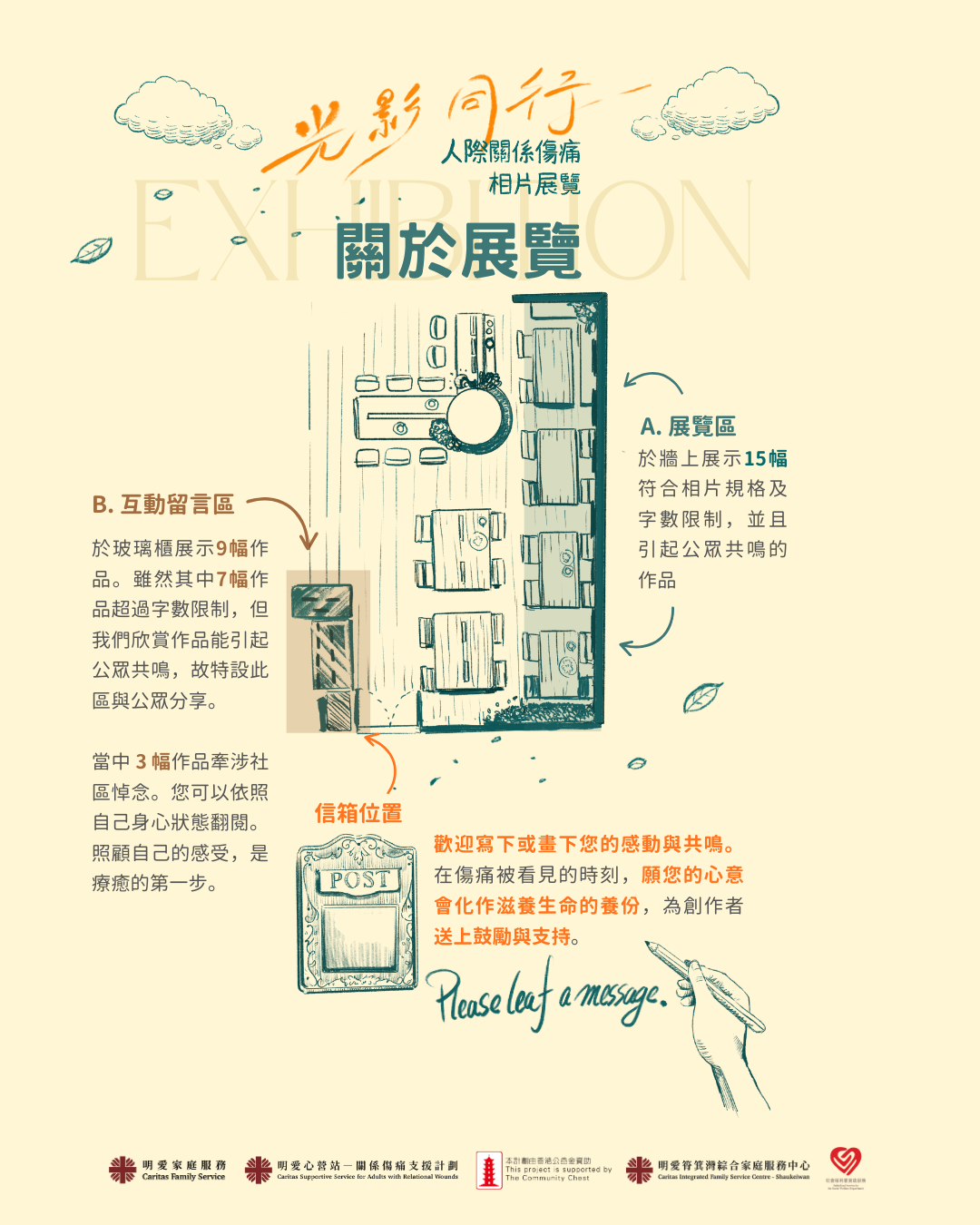 在瀏覽展覽的過程中,可能會觸動您內心的一些回憶或情緒。請您在過程中覺察自己的狀態,按您感到舒服的步伐進行。如您感到不適,請容許自己休息一下,進行自我關顧。有需要時,可以向您信任的人傾訴,或者尋求專業協助。