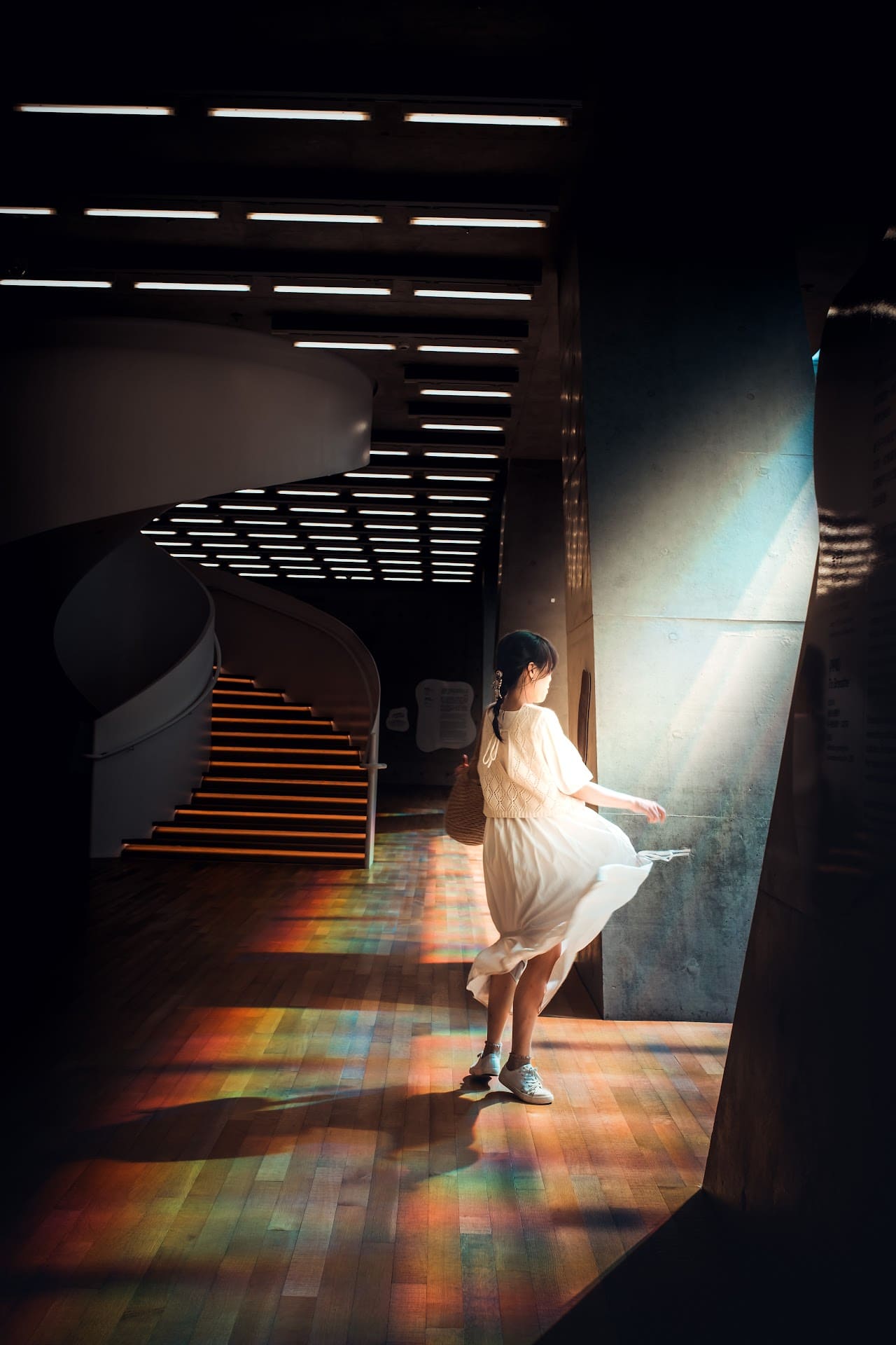 曾經在最黑暗的關係裡被反覆否定,連呼吸都覺得沉重。那段日子,我害怕光、害怕顏色,害怕所有會讓自己被看見的事物。如今,我獨自走進被彩虹光斑灑滿的走廊,白裙輕揚。沒有舞步,卻每一步都踩在自己的影子與光影交錯處。這是我用無數個崩潰的晚上一點一點拼回來的勇氣。從不敢被看見到終於允許自己發光,正是人際關係重創後,最動人的復原姿態。